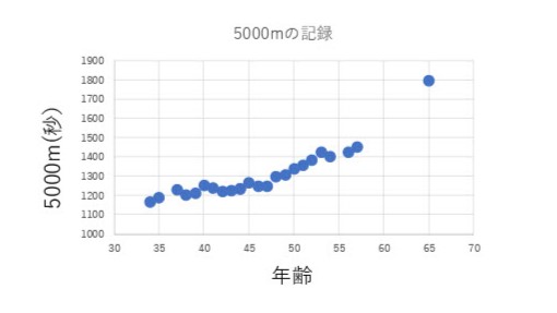 図は私がトレーニングとして走ってきたトラックでの5000mの記録が、30代半ばから30年でどう変化したかです。40代半ばまではそんなに低下はありませんが、40代後半から落ちが大きくなり、50代半ばで少し維持した後、また大きく落ちています。この低下には、50代から60代まで心臓不整脈手術を結果的に3度受けたことが影響していると思います。おそらく加齢による低下には個人の中では波があり、故障や病気で練習できなかった時に大きく低下し、再開すれば低下が少しおさまるというのを繰り返していくことが考えられます。そうなると、歳をとっても低下しないでいるには、故障や病気をせず健康でいることが一番です。それには加齢とともにトレーニングを慎重にしてやりすぎないように気を付け、頻度を減らすことと私は思います。