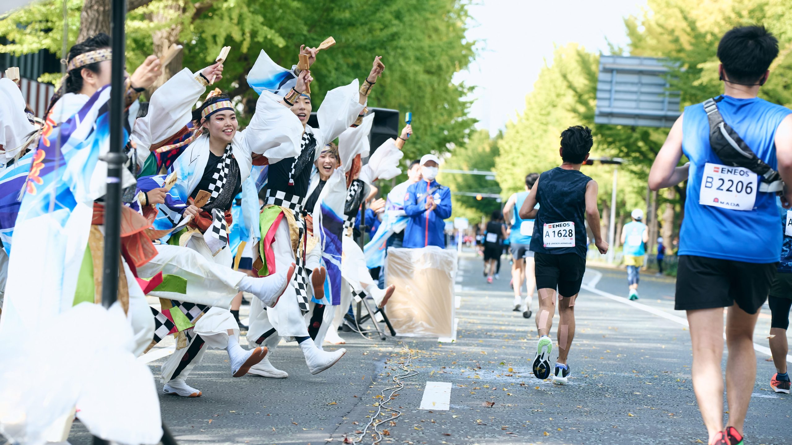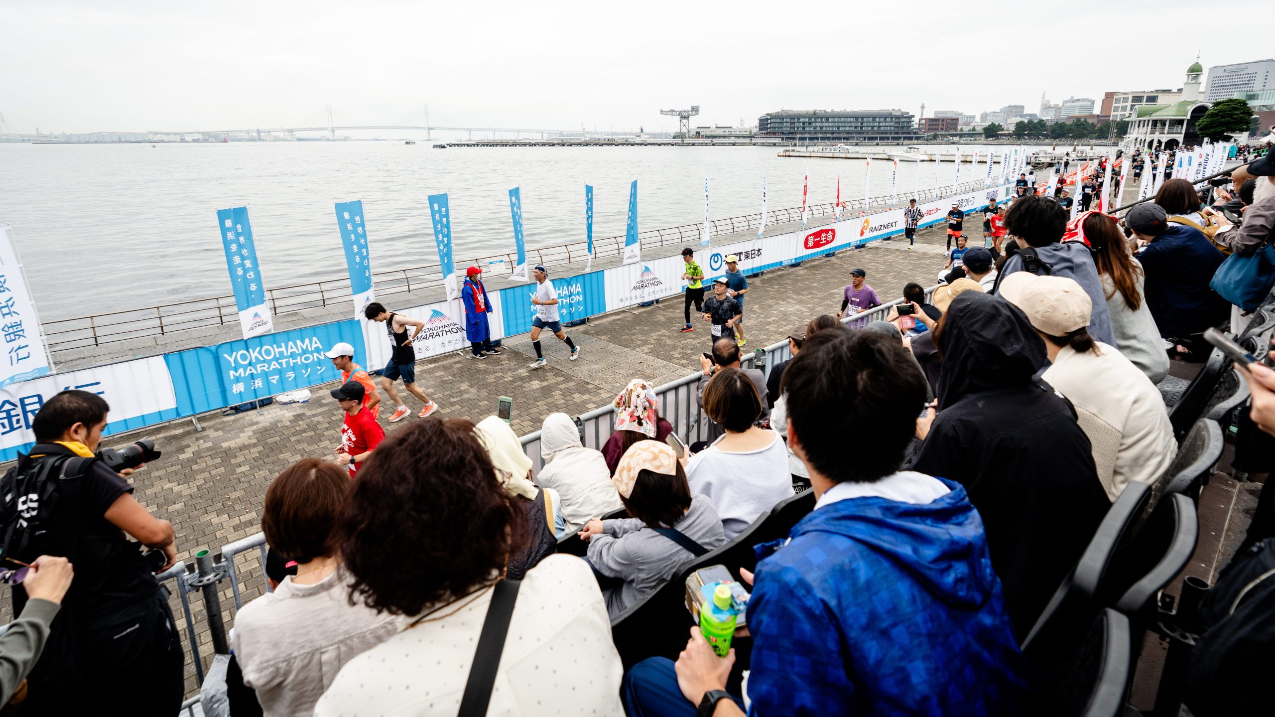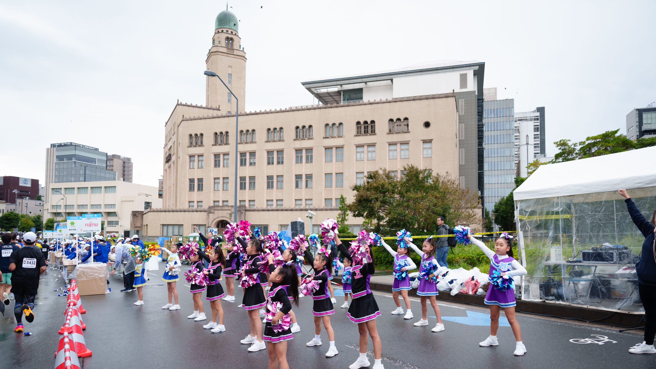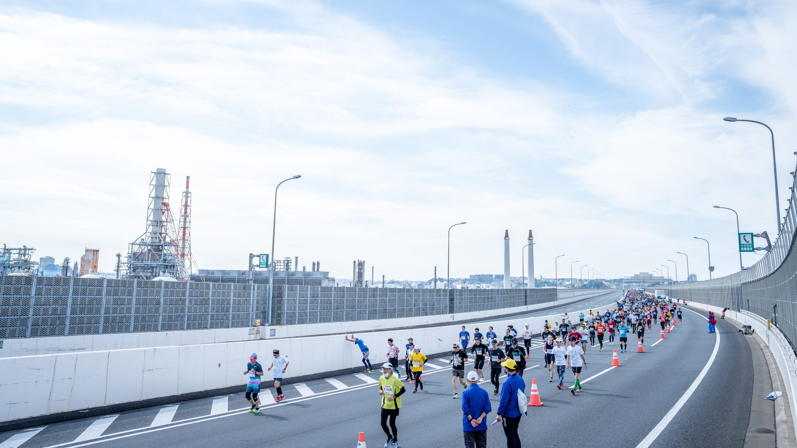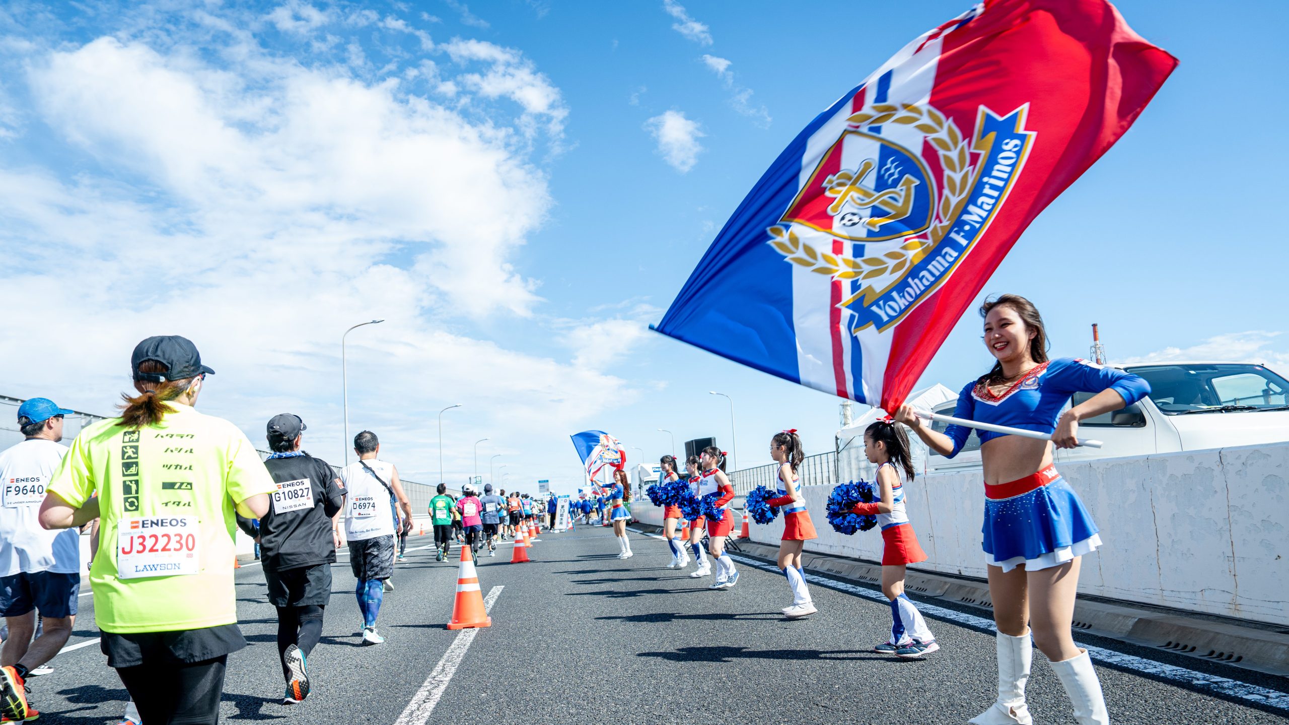 フルマラソン折返し地点を過ぎると、横浜マラソン名物・首都高速道路湾岸線に入ります。普段は走ることができない高速道路を走ることができます。また、横浜マラソンは給水所にて「ランナーを元気づける」をコンセプトに応援パフォーマンスを展開しています。