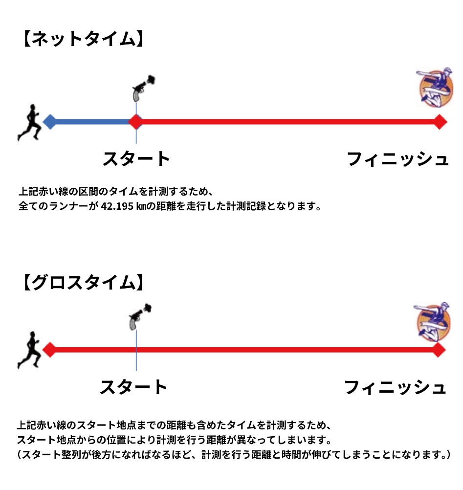 ネットタイムとは、大会スタート時のピストルが鳴った時から全てのランナーのタイム計測が一斉にスタートされるのではなく、それぞれのランナーごとのスタートラインからフィニッシュラインまでの時間を計測するタイムです。